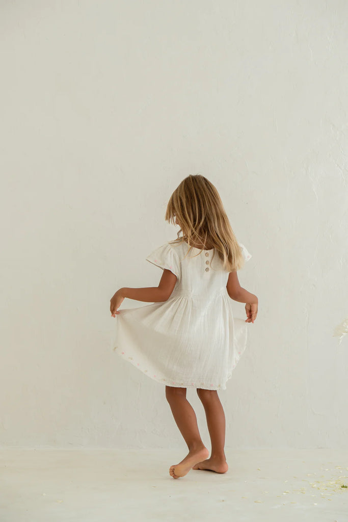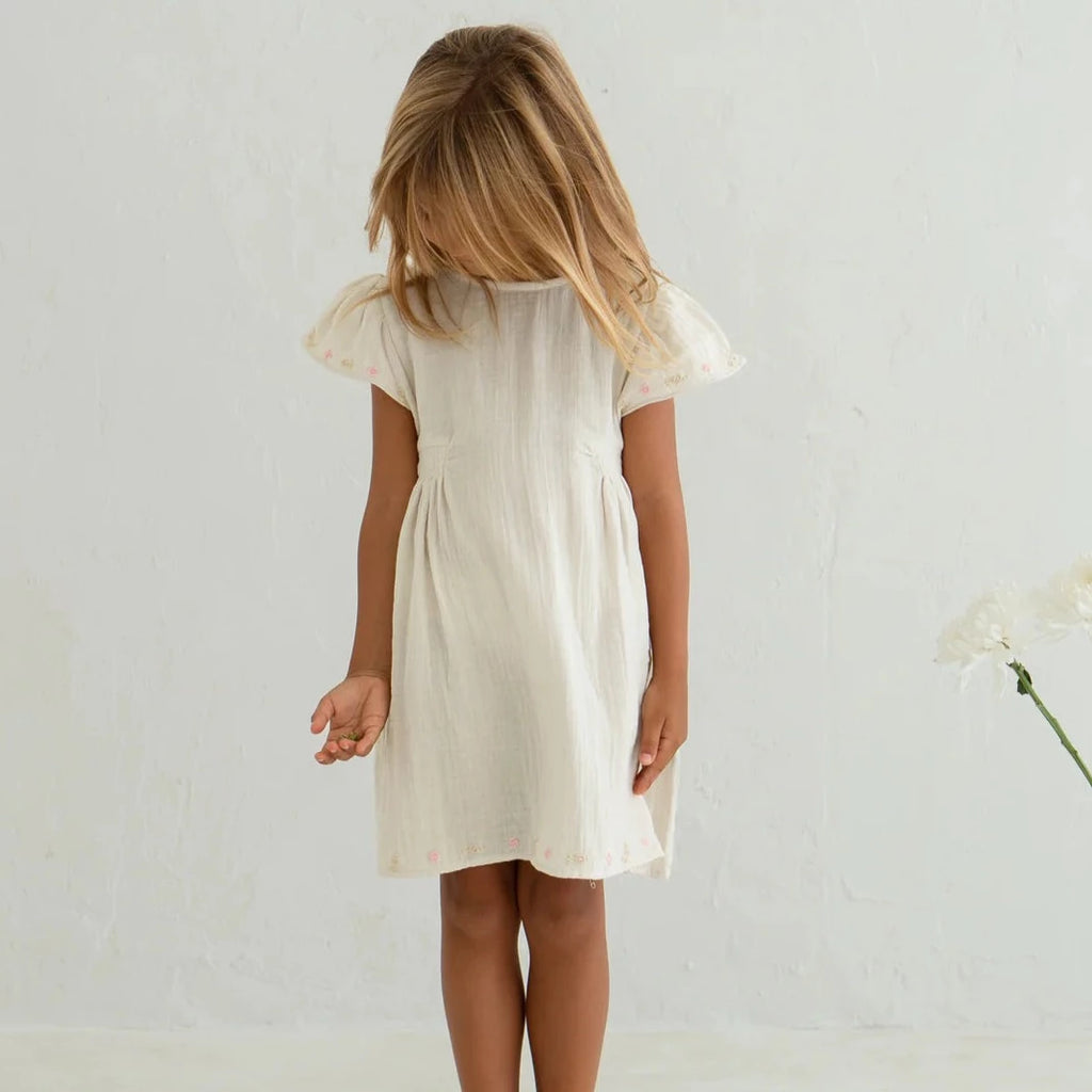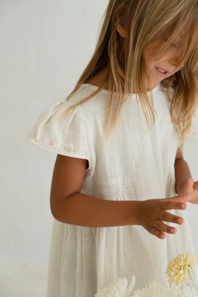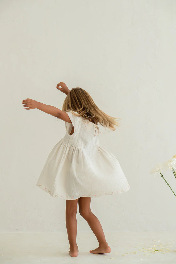Effortless, delicate and oh-so-sweet - our beloved blossom dress is crafted from lightweight and breathable cotton, with a beautiful hand-embroidered floral trim around the sleeve and hemline, hand-drawn in our spring palette of natural and peony pink.